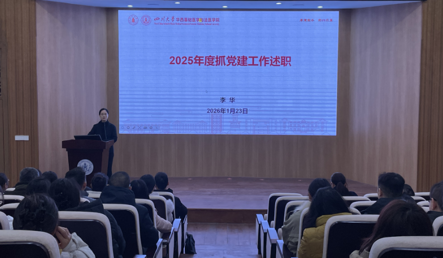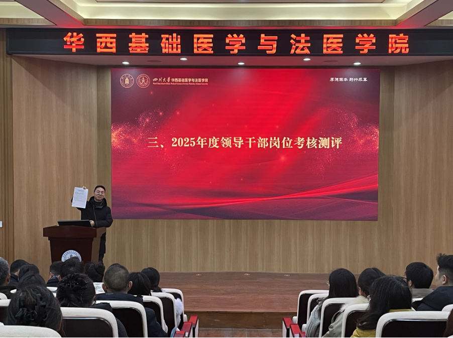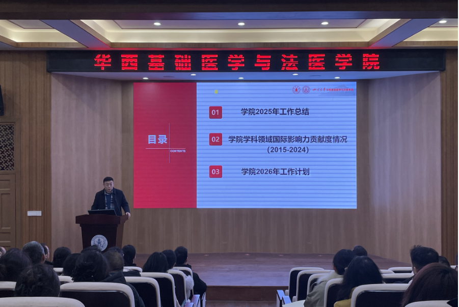 1月23日下午,学院在华西校区第五教学楼报告厅召开全院大会暨2025年度工作总结会。学院党政领导班子成员及全体教职工参会,学校党委组织部党校办公室主任吴先国同志到会指导,会议由学院党委副书记罗海玻同志主持。