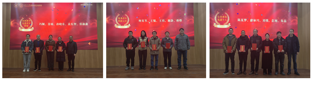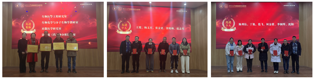 为弘扬争优创先精神,会上表彰了优秀教职工代表。学院根据2025年度工作考核结果,表彰了生物医学工程研究室、生物化学与分子生物学教研室、应激医学研究室、法医毒(药)物分析教研室四个先进集体,陈利弘、丁艳、范飞、何金蕾、李钢琴、沈阳、王霞、杨文星、张金虎、张晓梅、赵志伟十一位先进个人,冯颖、姜楠、孙晓东、袁东智、张淑鑫五位优秀青年教学之星,何贞岑、王魁、王祎、谢静、曾烨五位优秀青年科研之星,陈夏梦、廖林川、刘戟、彭旭、朱磊五位公共事务先进个人,学院领导为获奖集体、个人颁发荣誉证书,全院教职工以热烈的掌声向获奖者表示衷心的祝贺。