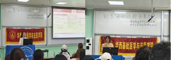 在经验分享环节,2021级基础医学强基计划的练珊同学结合自身大创经历,分享了实验设计、数据处理、论文撰写与竞赛参与等方面的实用技巧。她鼓励同学们在项目中积极主动,勇于解决问题。2023级法医专业的苗雨时同学则从低年级视角出发,分享了快速融入团队、与导师有效沟通的经验,并对项目选择等问题给出建议,为同学们的项目规划提供了有益参考。
