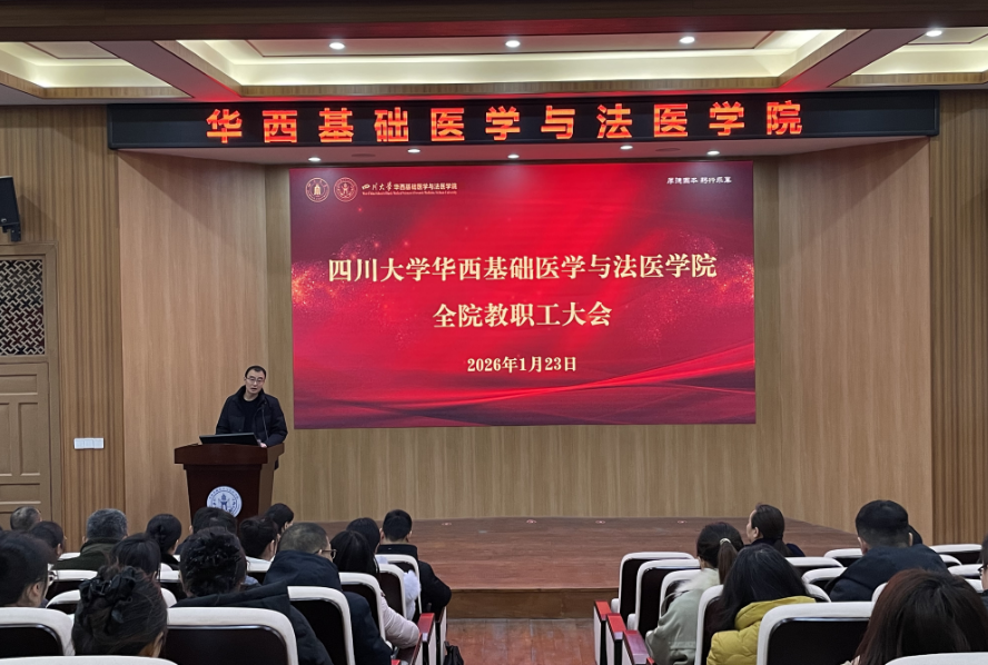 1月23日下午,学院在华西校区第五教学楼报告厅召开全院大会暨2025年度工作总结会。学院党政领导班子成员及全体教职工参会,学校党委组织部党校办公室主任吴先国同志到会指导,会议由学院党委副书记罗海玻同志主持。罗海玻主持会议会上,学院党委书记李华同志作了题为《党建引领固根本,融合创新争一流》的述职报告,全面总结学院2025年度的党建工作。她指出,2025年度学院领导班子坚持以习近平新时代中国特色社会主义思想为指导...