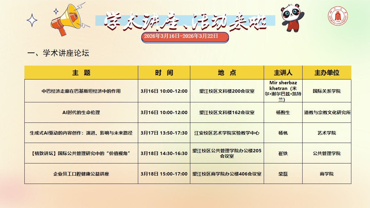 四川大学学术讲座论坛、校园文化活动预告(2026年3月16日-2026年3月22日)
