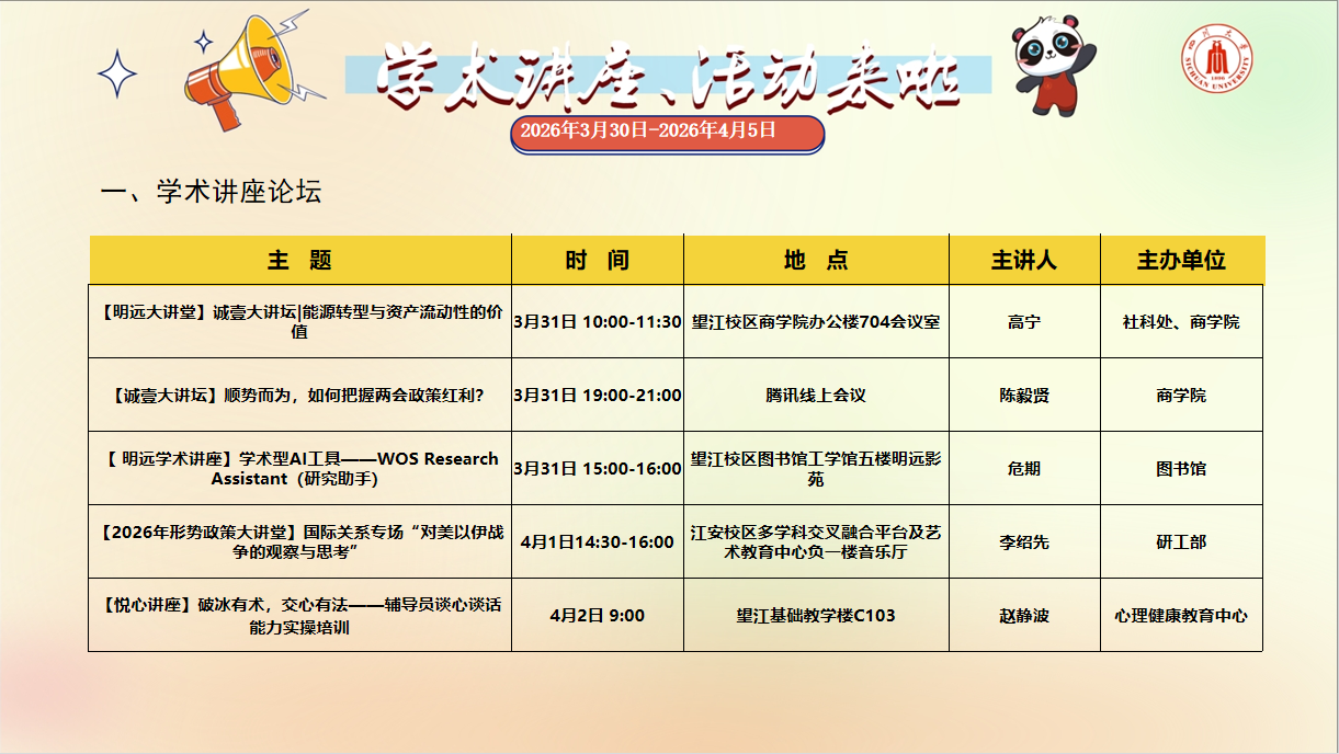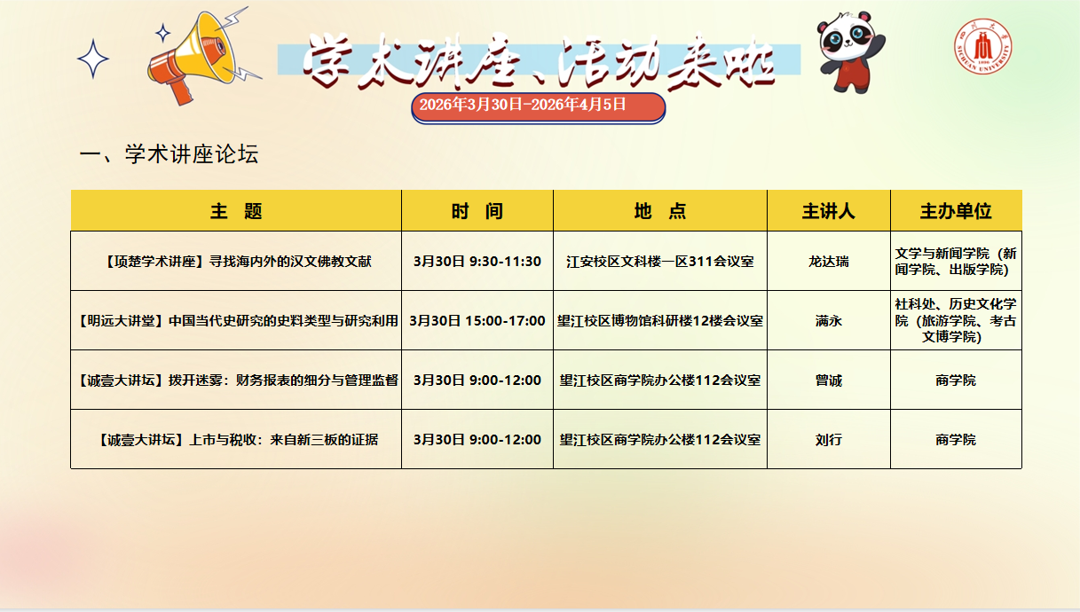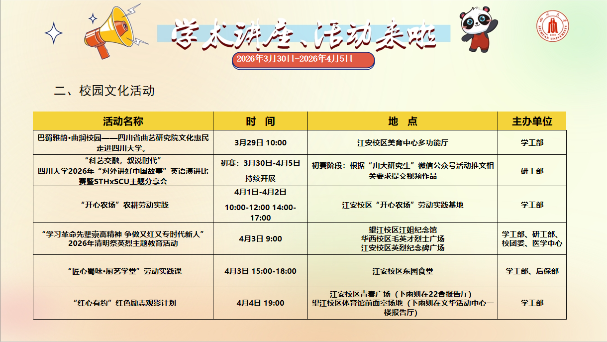 四川大学学术讲座论坛、校园文化活动预告(2026年3月30日-2026年4月5日)