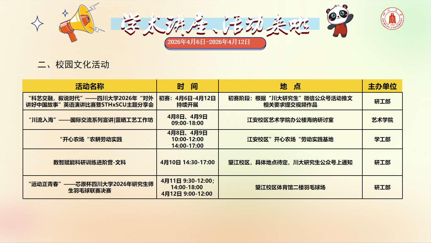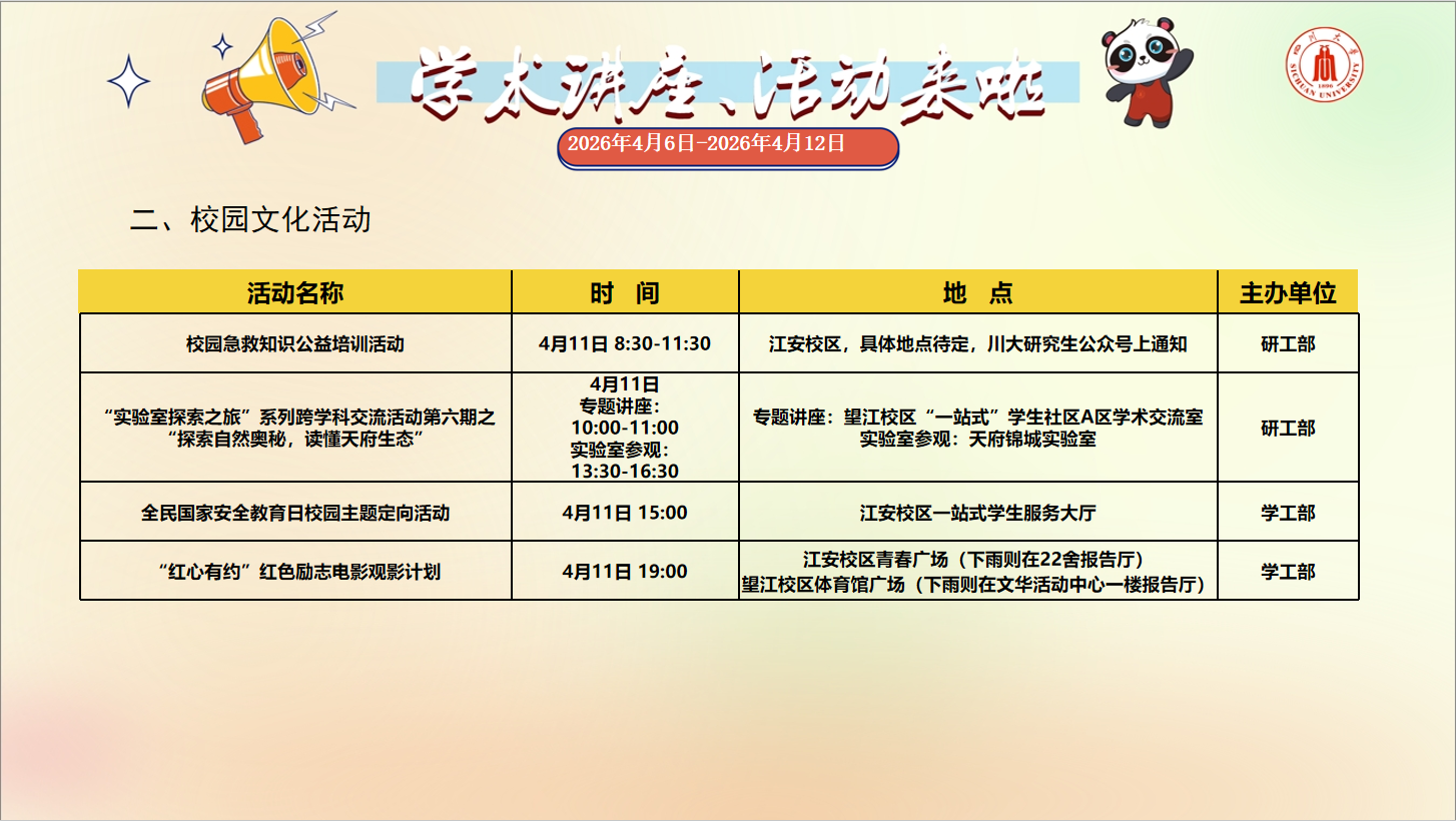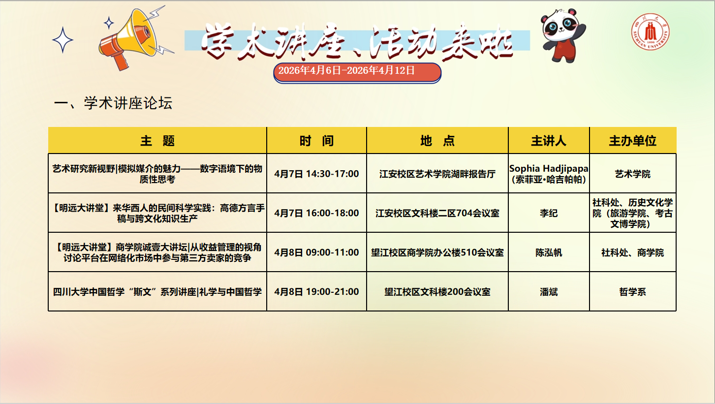 四川大学学术讲座论坛、校园文化活动预告(2026年4月6日-2026年4月12日)