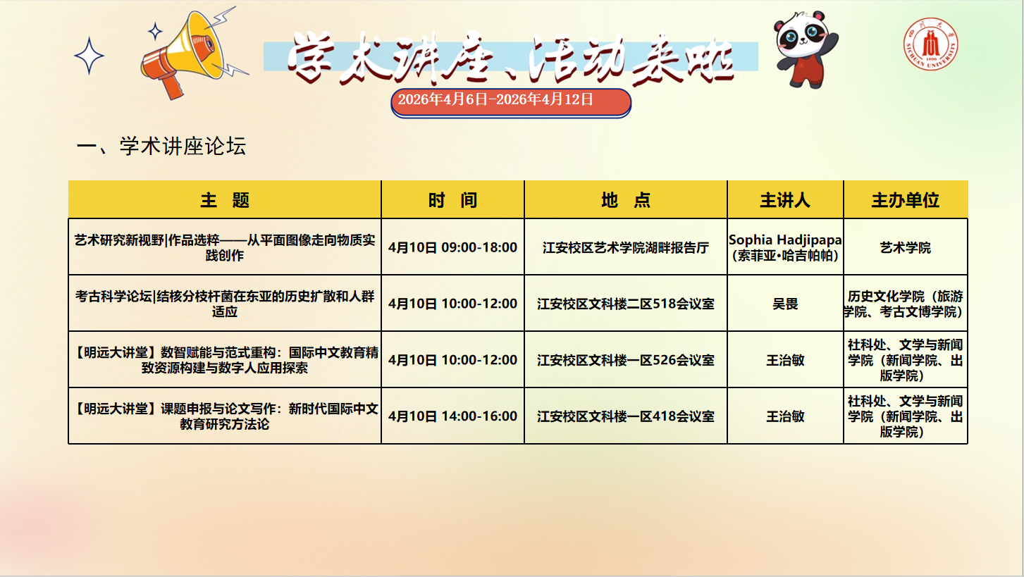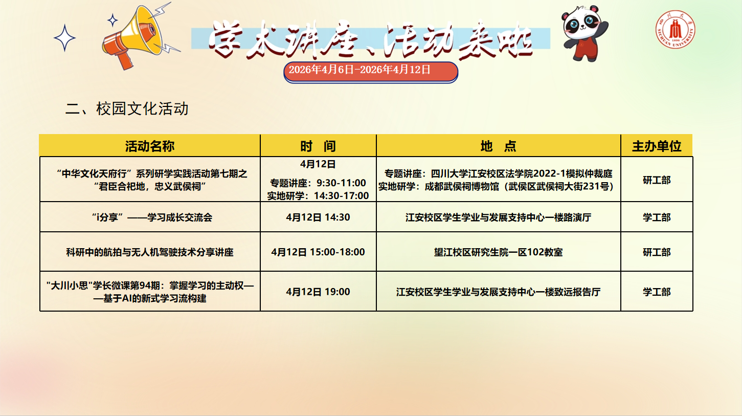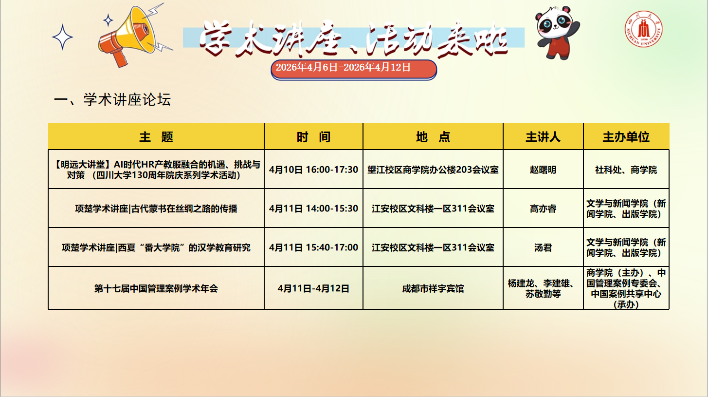 四川大学学术讲座论坛、校园文化活动预告(2026年4月6日-2026年4月12日)