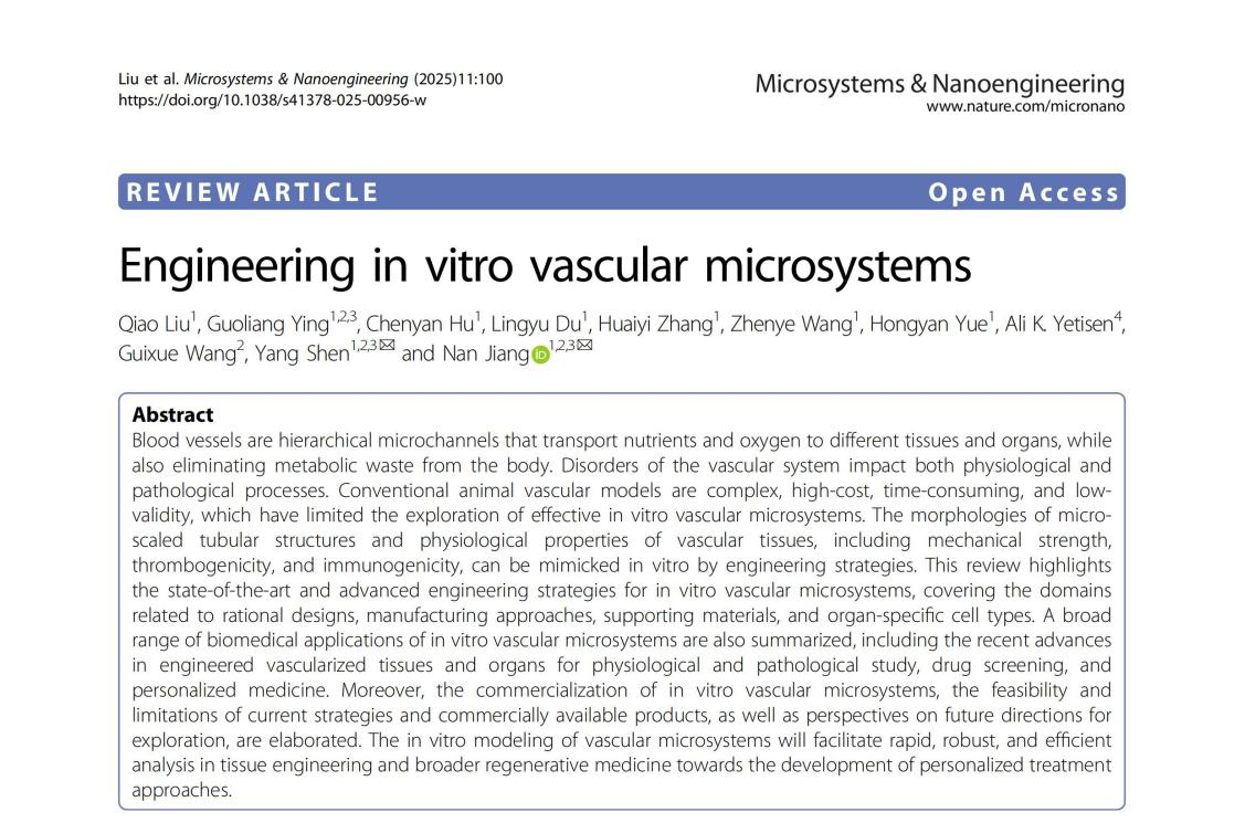血管系统是体内运输营养和氧气、清除代谢废物的重要网络。传统动物模型因复杂、高成本、耗时及有效性不足,限制了体外血管模型的发展。因此,如何在体外构建模拟真实血管形态和功能的微系统成为了研究的热点。近日,我院姜楠团队和沈阳团队在Springer Nature旗下期刊,工程技术1区杂志Microsystems &Nanoengineering(IF 9.9)上发表综述论文(图1),总结了体外血管微系统在多个生物医学领域中的广泛应用,包括工程化血管化组织与器官、药物筛选、疾病模型构建以及个性化治疗方案的开发;探讨了当前商业化策略与产品的可行性及局限性,并展望了未来的发展方向。该论文的第一作者是刘巧硕士和应国量副教授。